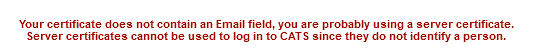 I tested with a new created server certificate from the test server which I imported via mmc to the windows truststore. With Chrome I was able to connect to the cats1 but this error message is shown: Your certificate does not contain an Email field, you are probably using a server certificate. Server certificates cannot be used to log in to CATS since they do not identify a person. => ok With a client certificate the login worked perfectly. =>ok =>ok |