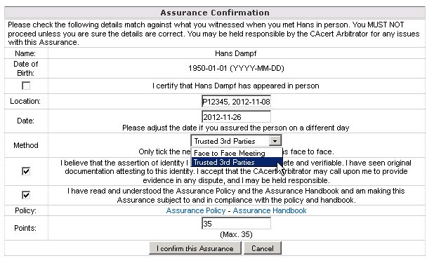 part 1: "Please check the following details match against what you witnessed when you met Hans in person. You MUST NOT proceed unless you are sure the details are correct. You may be held responsible by the CAcert Arbitrator for any issues with this Assurance." => requires a change to meet F2F _and_ TTP assurances requirements "when you met Hans in person" !!! ... match against what has been witnessed by you when met USER in person or TTP met the USER in person that is documented in the related CAP form the second part is ok for F2F assurances and TTP assurances part 2: name -> ok part 3: DoB -> ok part 4: method -> ok part 5: I certify that Hans Dampf has appeared in person mhh .. for F2F this section is NOD TTP-CAP form doesn't give any statement, that the meeting was F2F (the Assuree appeared in person) at least not on the documentation page on page 2 (notes/instructions to the TTP) the following applies: "The purpose of this document is to validate that the person who appears in front of you is actually who they say they are. Please verify the individuals identity documents as per your states Notarial requirements." part 6: I certify that User has accepted CCA F2F-Assurer: did ask, documented on CAP TTP-Assurer: did ask, documented on TTP-CAP part 4: location -> ok still to continue ... |