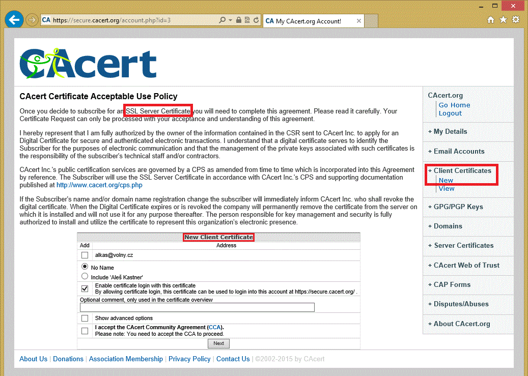 Steps To Reproduce | Log in to www.cacert.org to your account. Select from right menu "Client Certificates", "New". Look to the left part of the window. | ||||