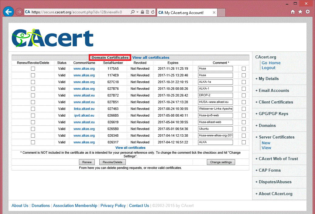| Steps To Reproduce | After login to your account at CAcert, open "Server certificates" - "View" from the menu, then observe the heading of the main part of the window. |