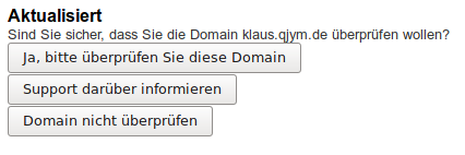Description | the German translation of the verify.php?type=domain ... page is completely wrong. it reads "bitte überprüfen Sie diese Domain". If I hadn't done this before and could guess that "verify" is meant I hadn't understood it. please change it to "bestätigen" (also on the confirmation page that follows), which is the correct translation in this case. (and please introduce a translation process that includes testing the ui with the generated strings, then this would have been noticed) | ||||