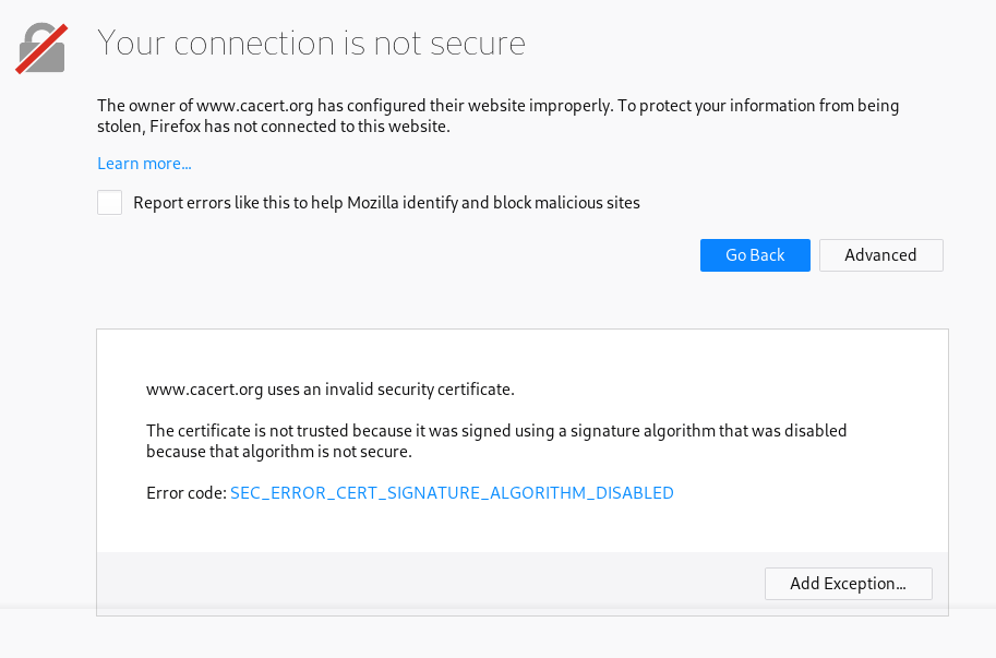 | Description | Using Firefox 63.0 on Manjaro Linux 18.0 (Kernel Linux 4.14.78-1-MANJARO) I can't access https://www.cacert.org/ website at all to fetch/update my certificates. Error code is SEC_ERROR_CERT_SIGNATURE_ALGORITHM_DISABLED | ||||