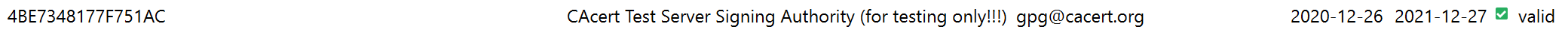 | Steps To Reproduce | Sign a gpg key with the gpg signing feature of cacert. Import key to gpg. Check the signatures of the key. | ||||