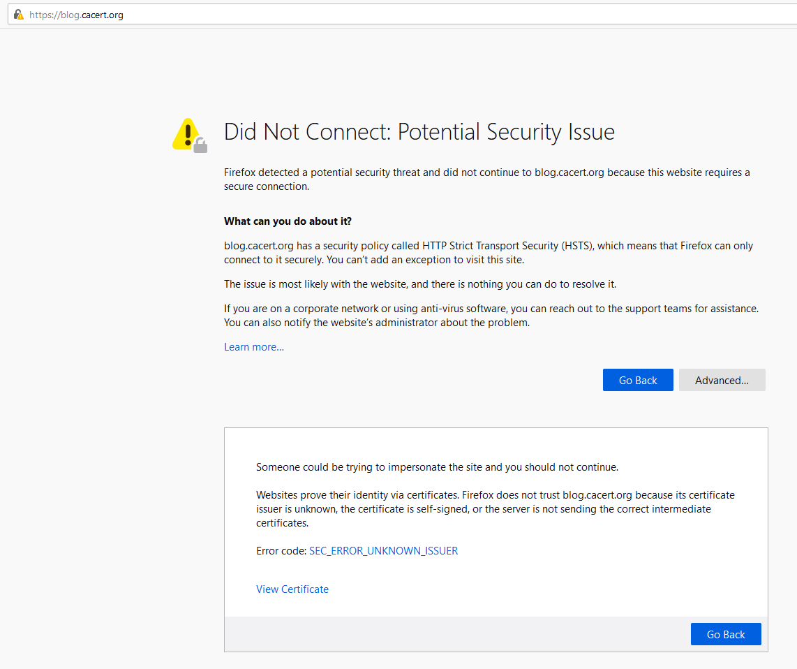 | Additional Information | Error Message displayed: Did Not Connect: Potential Security Issue Firefox detected a potential security threat and did not continue to blog.cacert.org because this website requires a secure connection. What can you do about it? blog.cacert.org has a security policy called HTTP Strict Transport Security (HSTS), which means that Firefox can only connect to it securely. You can’t add an exception to visit this site. The issue is most likely with the website, and there is nothing you can do to resolve it. If you are on a corporate network or using anti-virus software, you can reach out to the support teams for assistance. You can also notify the website’s administrator about the problem. Learn more… Someone could be trying to impersonate the site and you should not continue. Websites prove their identity via certificates. Firefox does not trust blog.cacert.org because its certificate issuer is unknown, the certificate is self-signed, or the server is not sending the correct intermediate certificates. Error code: SEC_ERROR_UNKNOWN_ISSUER View Certificate | ||||