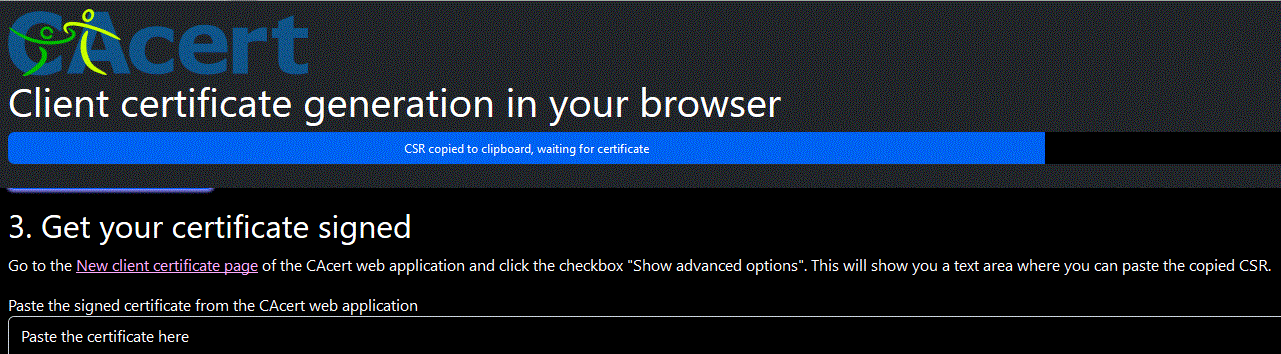 I tried it and for me it works as following: Step 1 OK Step 2 OK Step 3 - if CSR copied into the field at the "Client Certificate Generator" -> nothig happend (I cannot see a button to press to contnue and the field with the CSR copied in does not start on his own. Step 3 - if I follow the link "New client certificate page" I come to https://secure.cacert.org/account.php?id=3 and when I click on "Weiter" it works (but maybe as I have allready a CAcert cert installed in my browser? I will check it with another browser and add another note) Tested with Vivaldi 5.6.2867.62 (Stable channel) stable (64-Bit) Betriebssystem Linux (Ubuntu 16:04 LTS) JavaScript V8 10.8.168.25 User-Agent Mozilla/5.0 (X11; Linux x86_64) AppleWebKit/537.36 (KHTML, like Gecko) Chrome/108.0.0.0 Safari/537.36 |