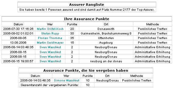 | Description | Today I have assured three people, everybody get the email, that he/she get points from me, but nobody have assurence points at the own account. | ||||