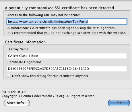 if this is error is displayed for Class 1 certificate then it is an error in the plugin. Root certificates with MD5 integrity on themselves are not a risk to users. If this is the case provide a bug report to the plugin provider. As you can appreciate, changing a root certificate on a CA where most users need to download a new certificate is not that desirable. As with all security its a cost benefit decision that takes place and at the moment the costs of replacing an Intermediate certificate exceed benefits for both CAcert and all its users. If you depend on the Class 3 certificate for some purpose this should be installed as a trusted root certificate and a good plugin should then ignore the warnings on this certificate. |